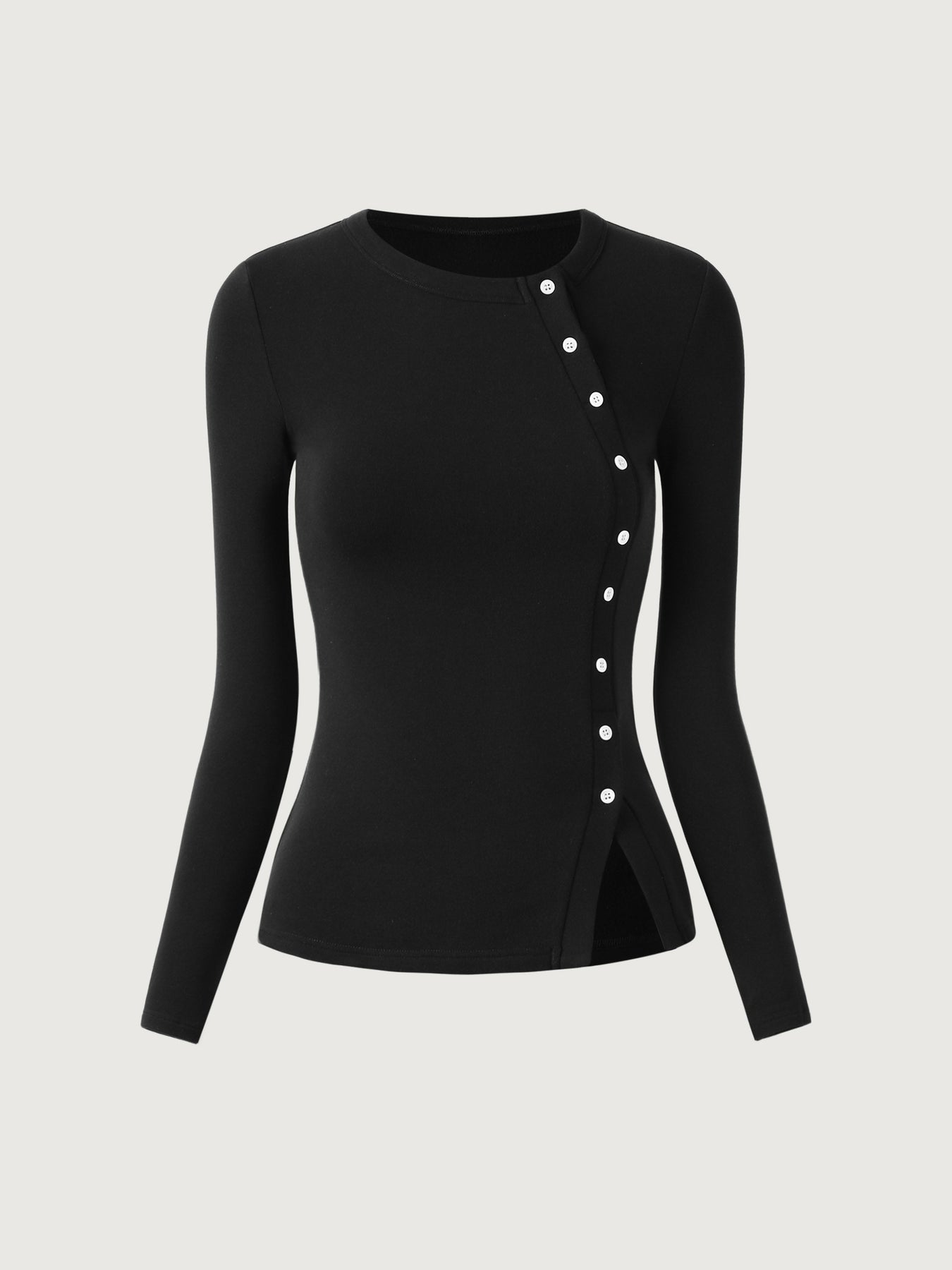 Ajoutez une touche moderne à vos tenues quotidiennes avec notre haut asymétrique à patte de boutonnage. La patte de boutonnage décentrée apporte une touche d'élégance naturelle à la silhouette épurée à col rond, tandis que les manches longues le rendent parfait pour les superpositions par temps frais. Associez-le à un pantalon large pour une tenue chic de jour comme de nuit.